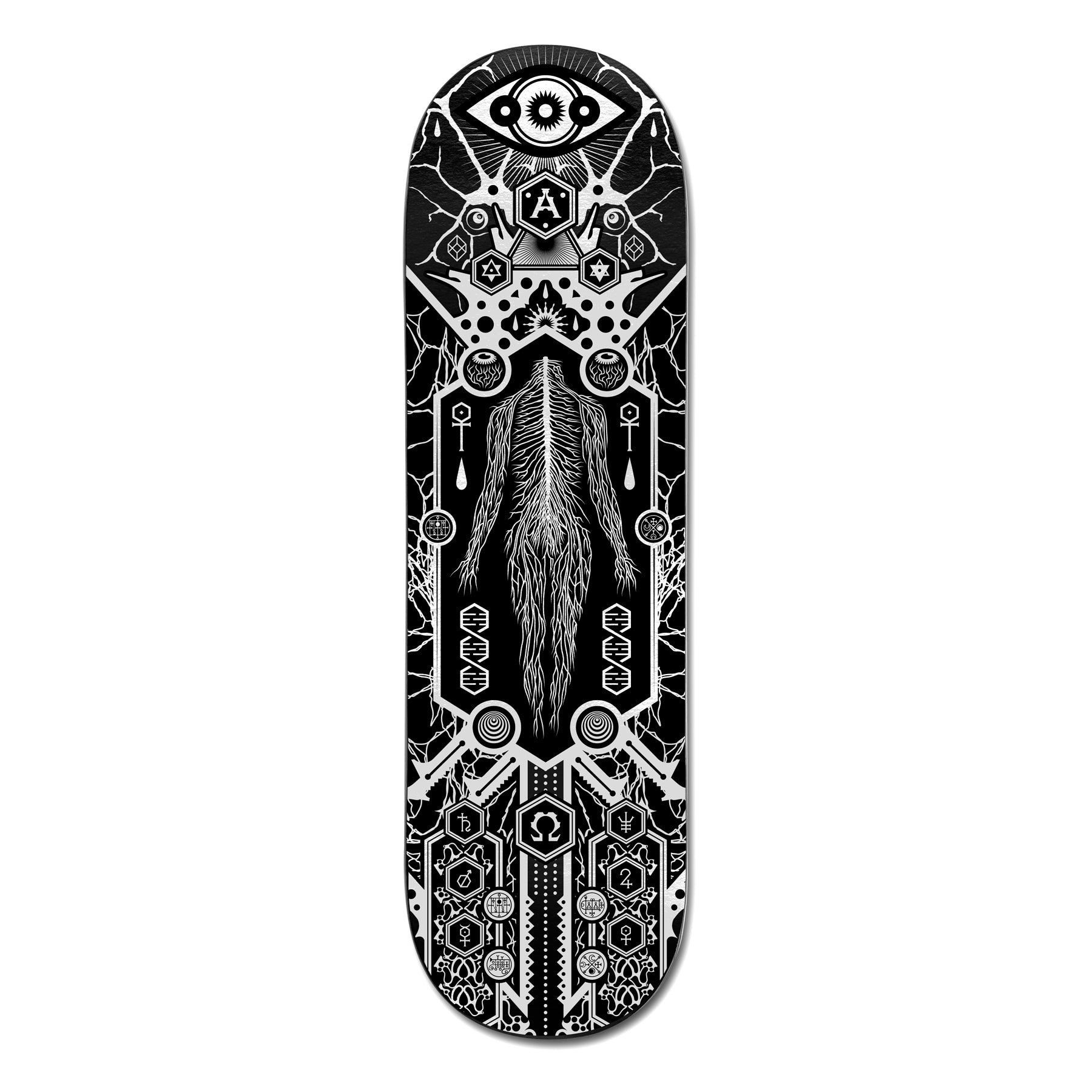 8.5" width skateboard deck. Ready to hang on the wall as decor or pop some gear on it and go!