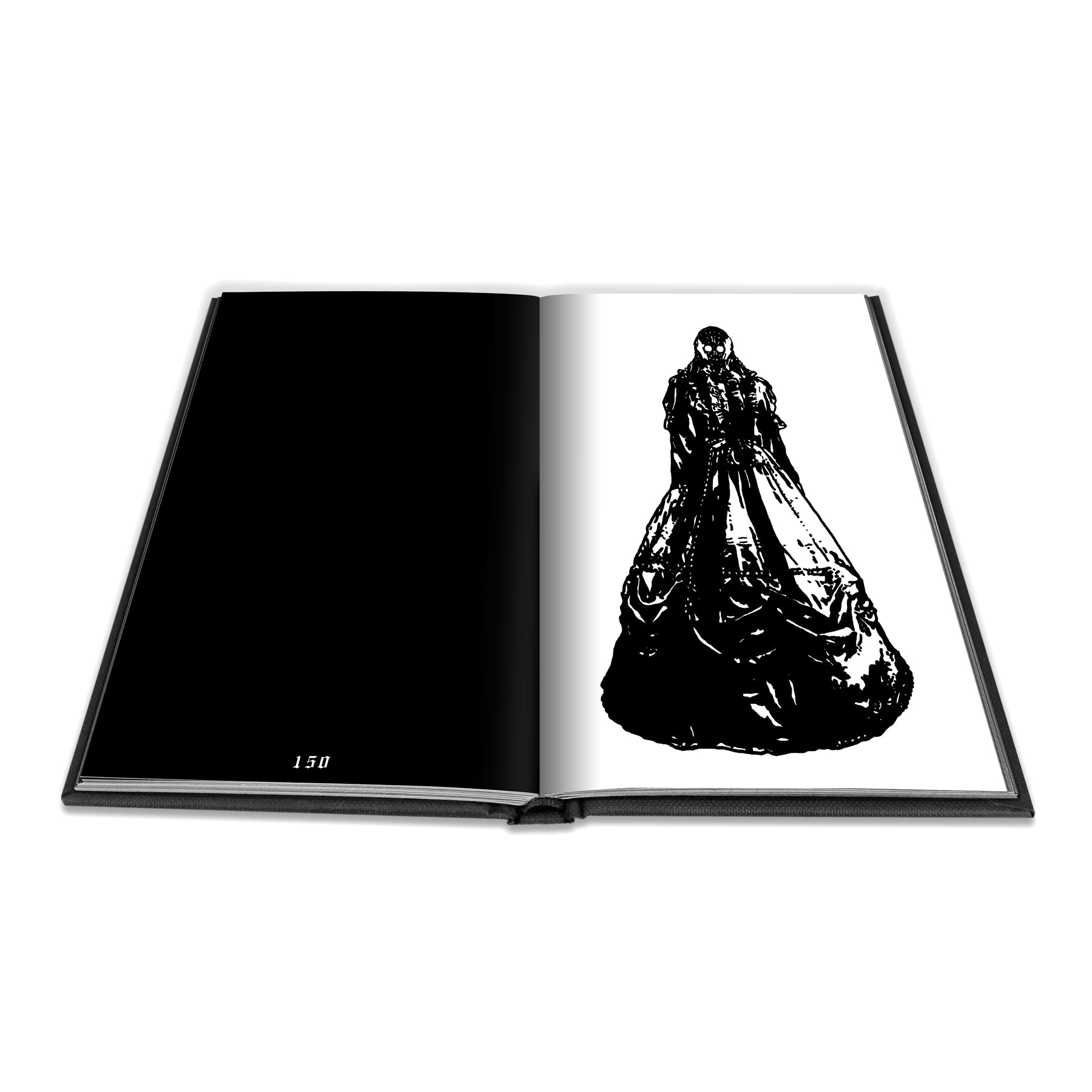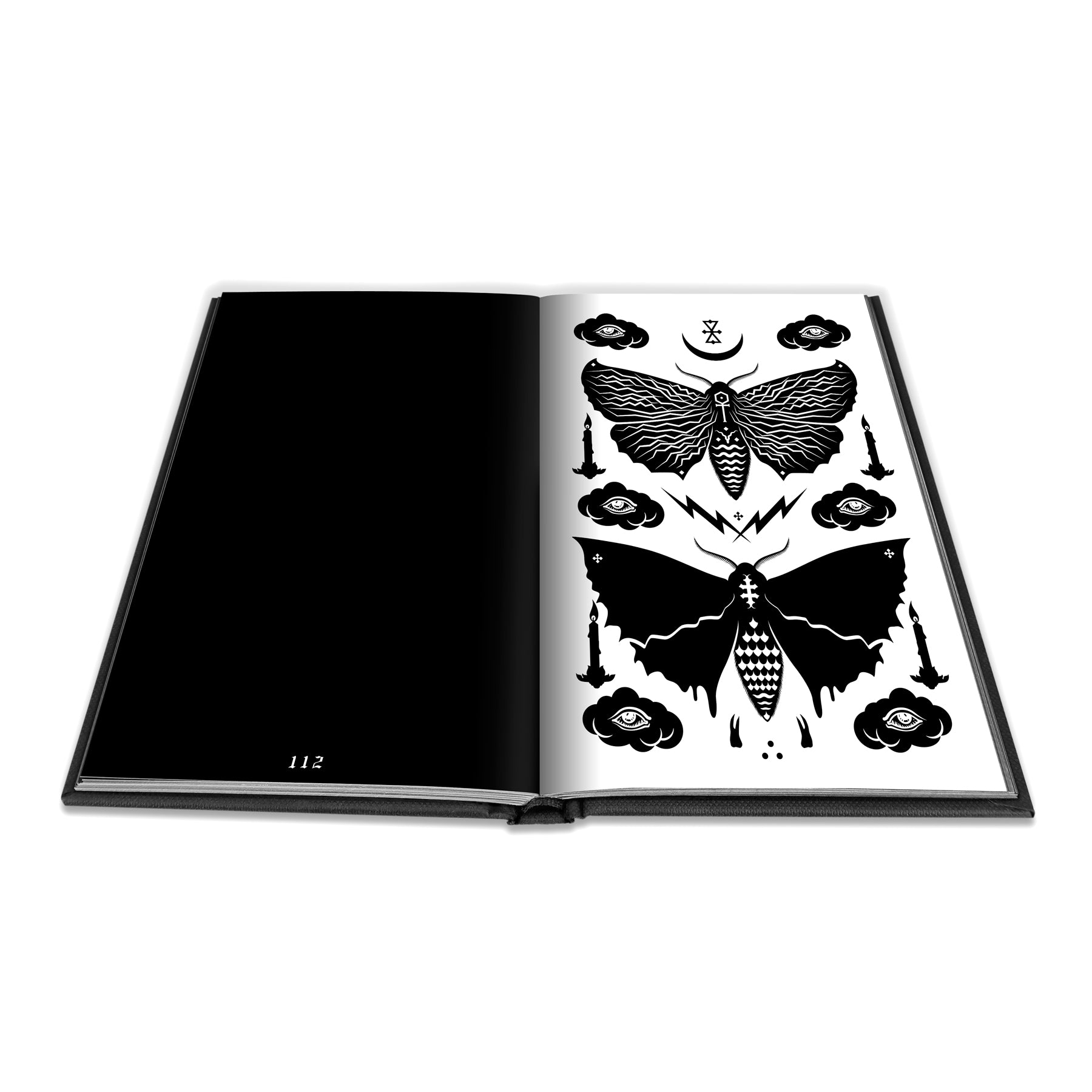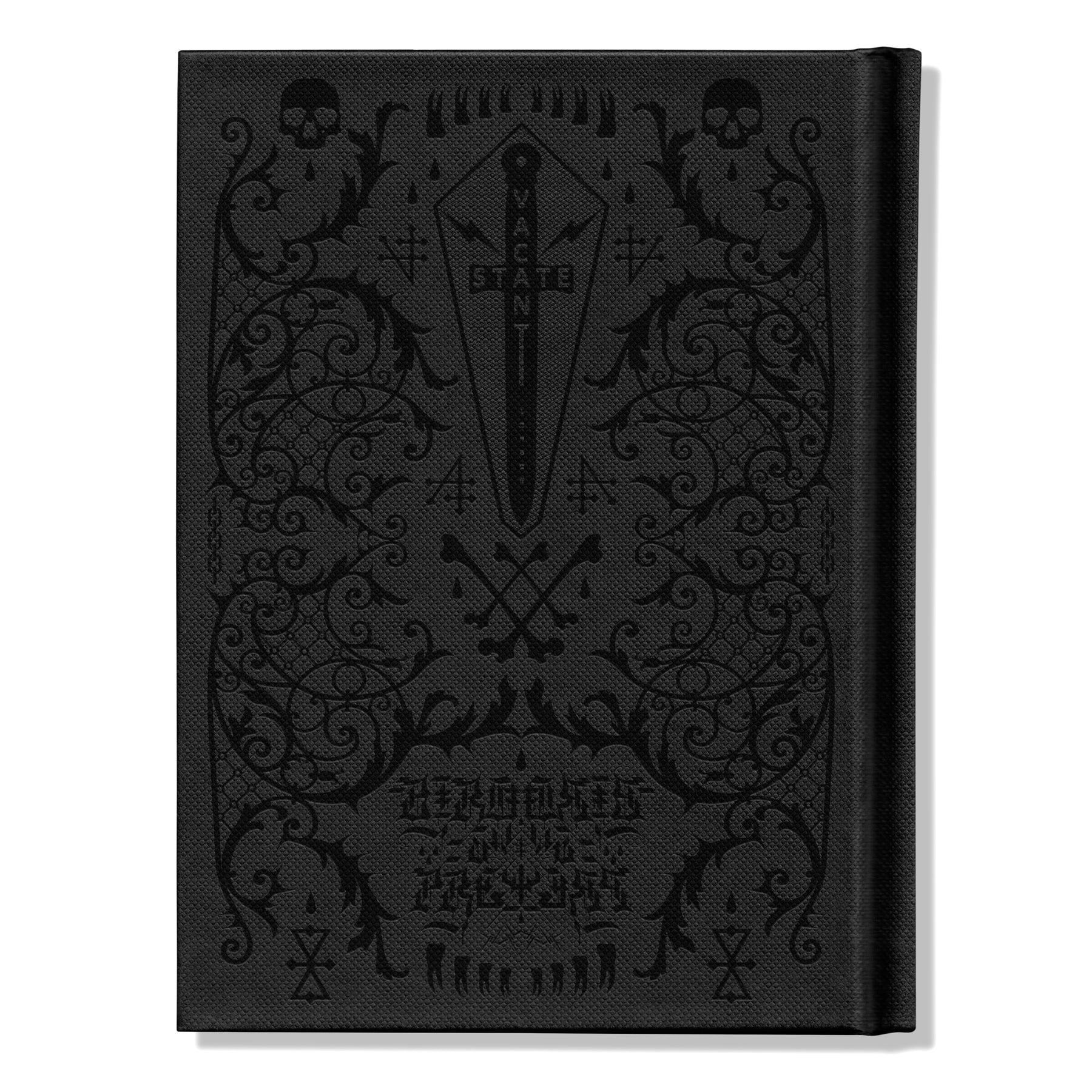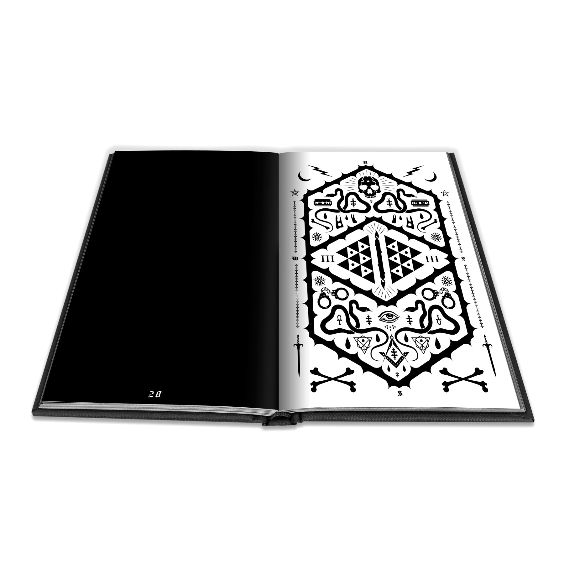 The book itself is an A5 (148mm x 210mm or approx. 6” x 8” ) sized black fabric textured hardcover with black stamping on the front, back and spine. The interior pages are black and white printed graphics on luxe matte stock.