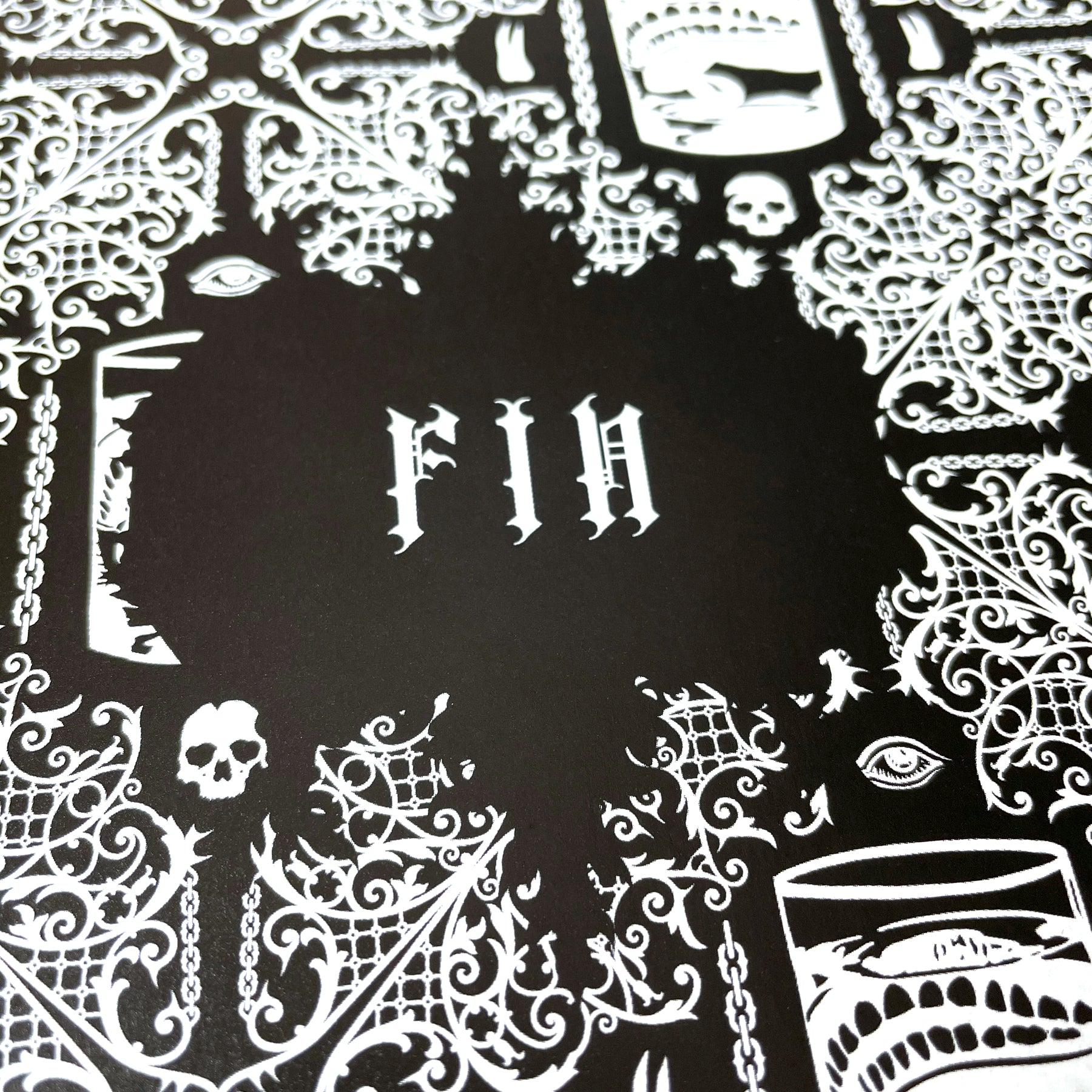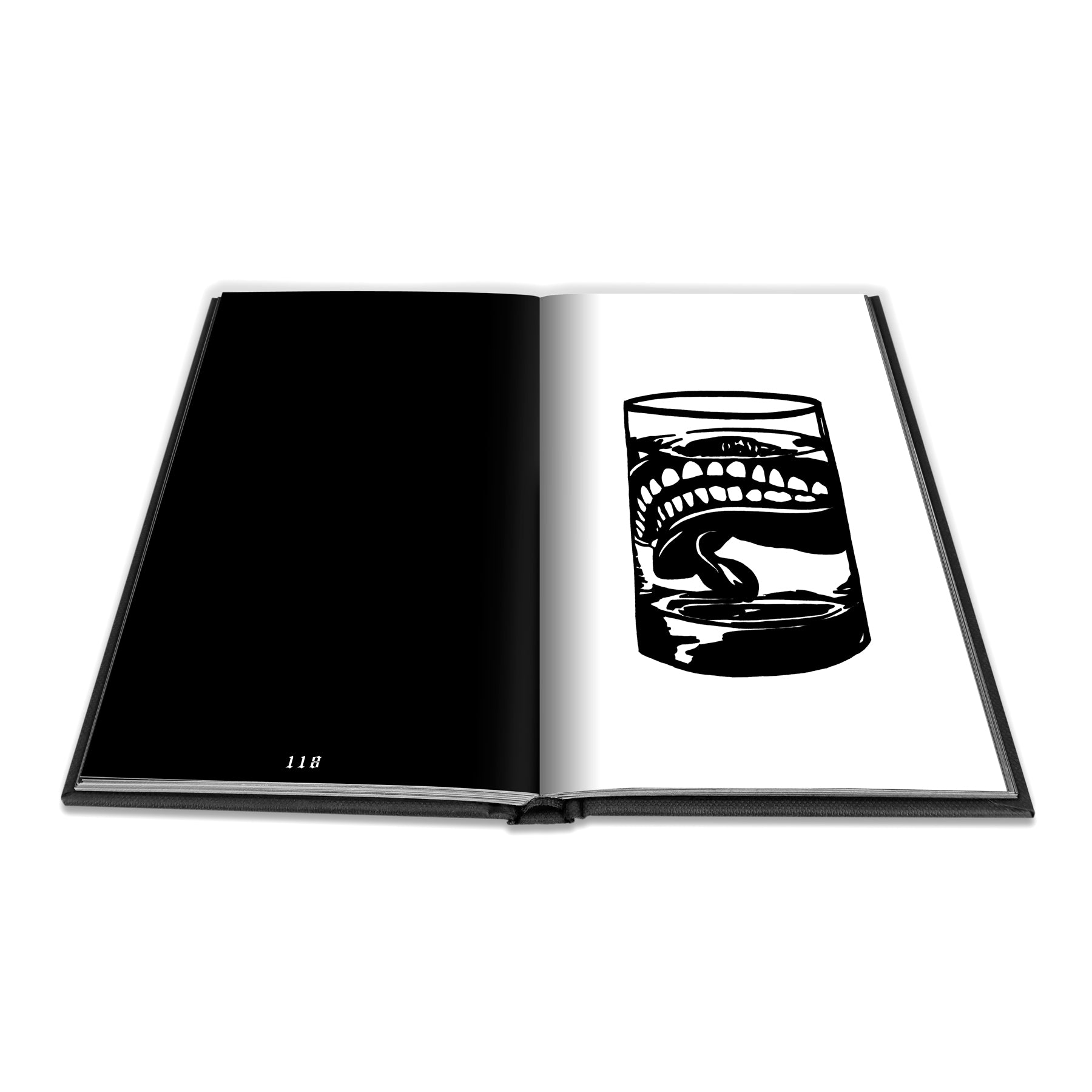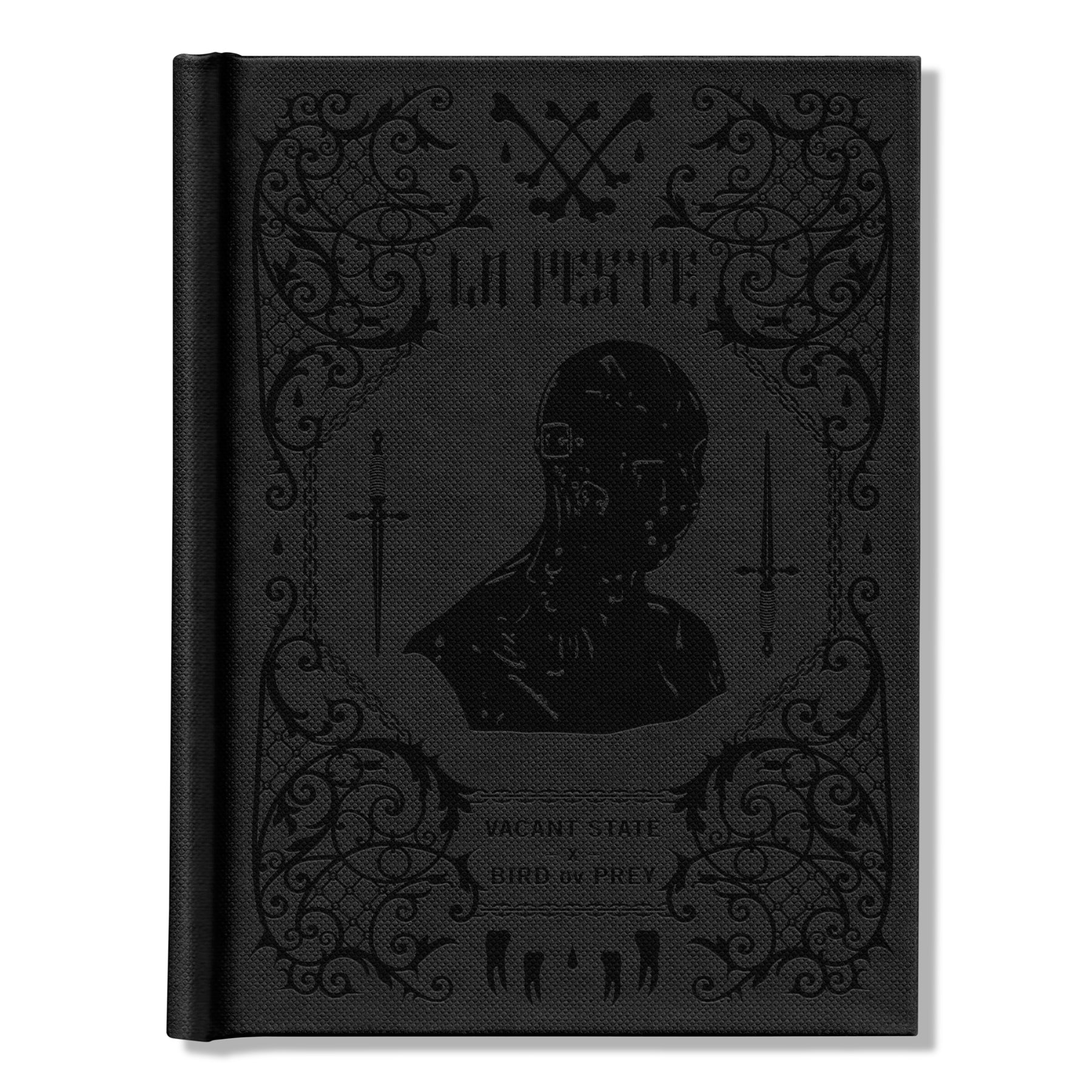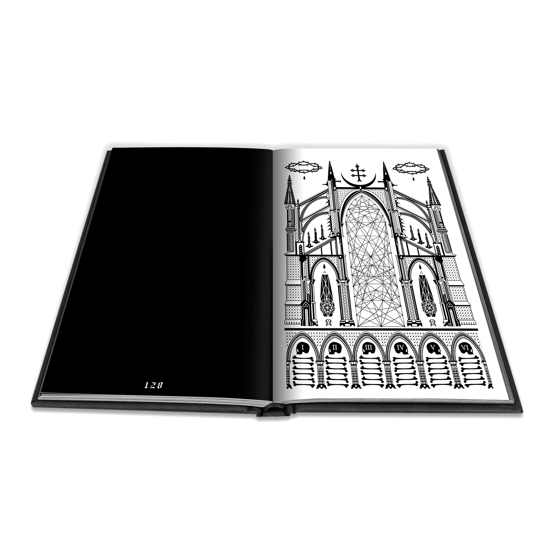 The book itself is an A5 (148mm x 210mm or approx. 6” x 8” ) sized black fabric textured hardcover with black stamping on the front, back and spine. The interior pages are black and white printed graphics on luxe matte stock.