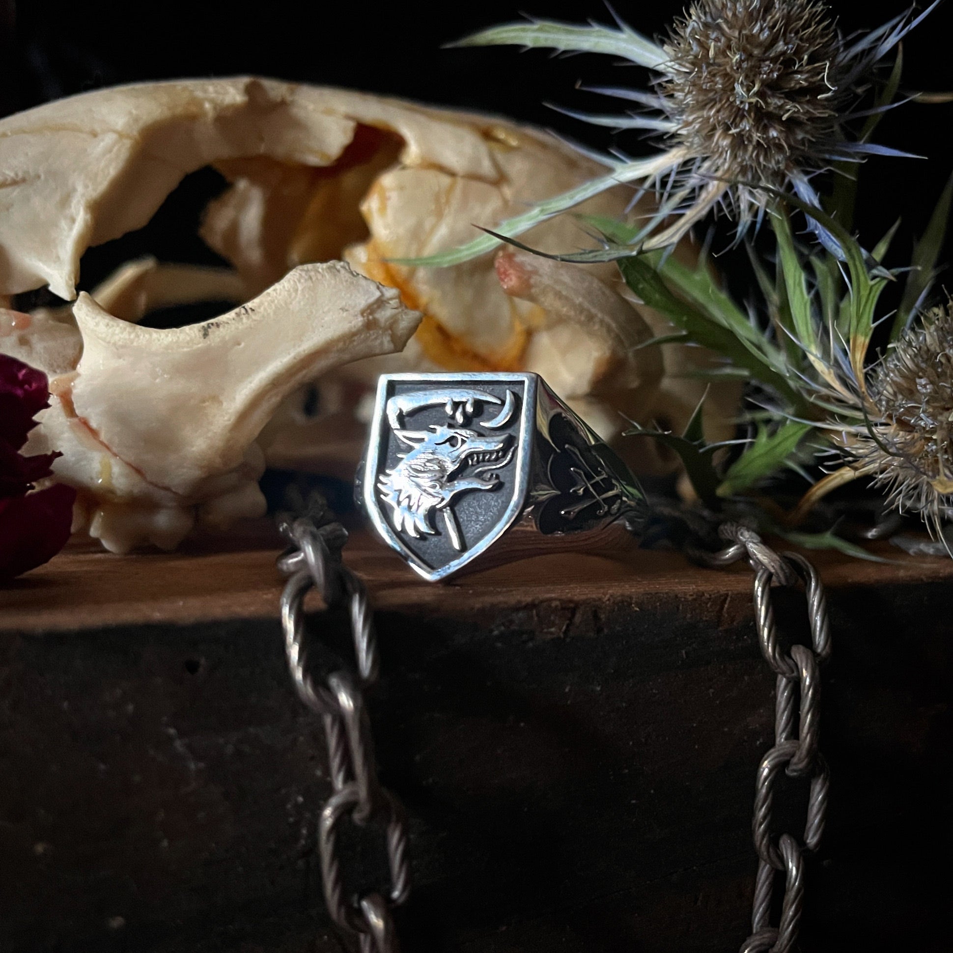 Sterling Silver Signet Ring featuring the Nachzehrer Patrol Wolf graphic on the top and accenting bone vertices on each side.