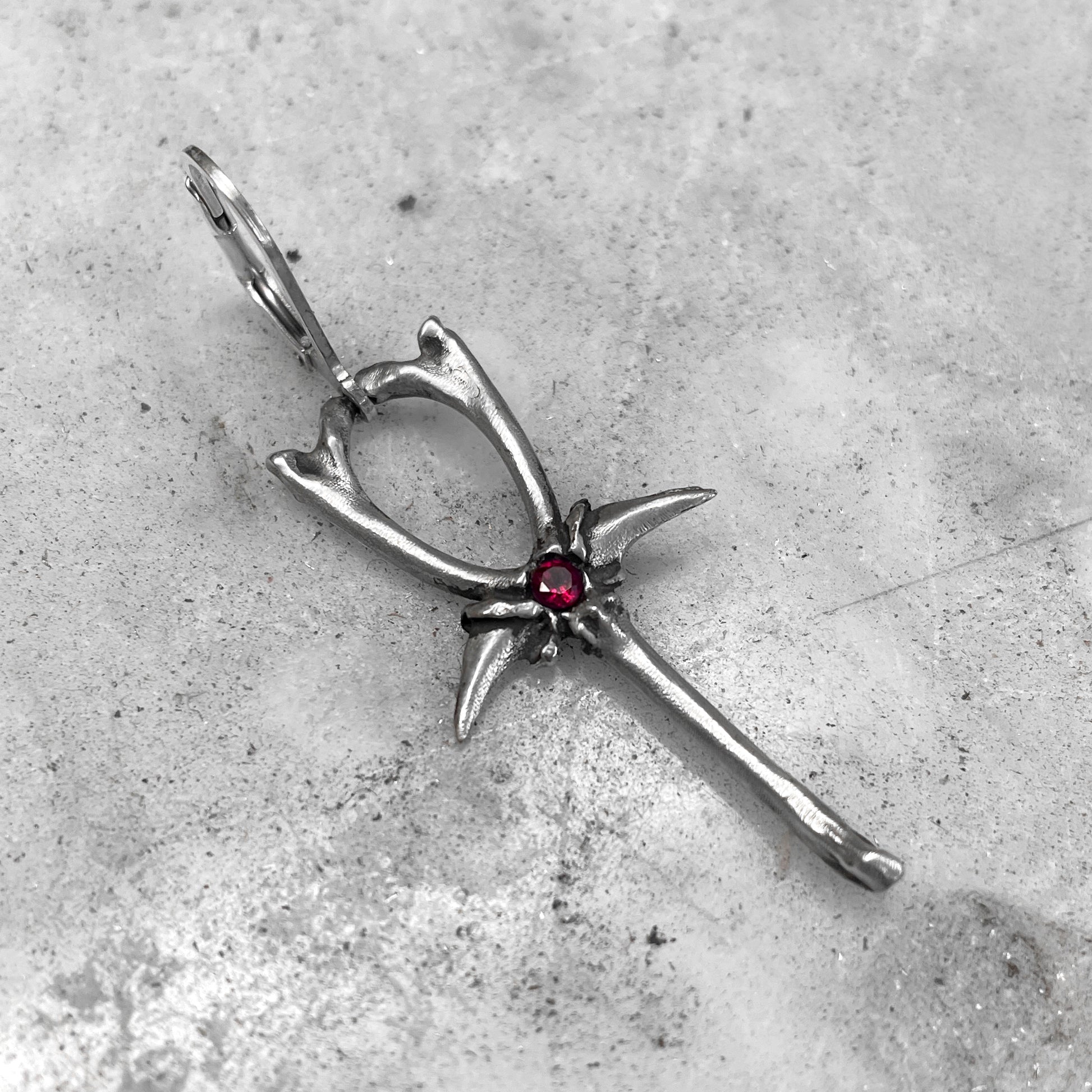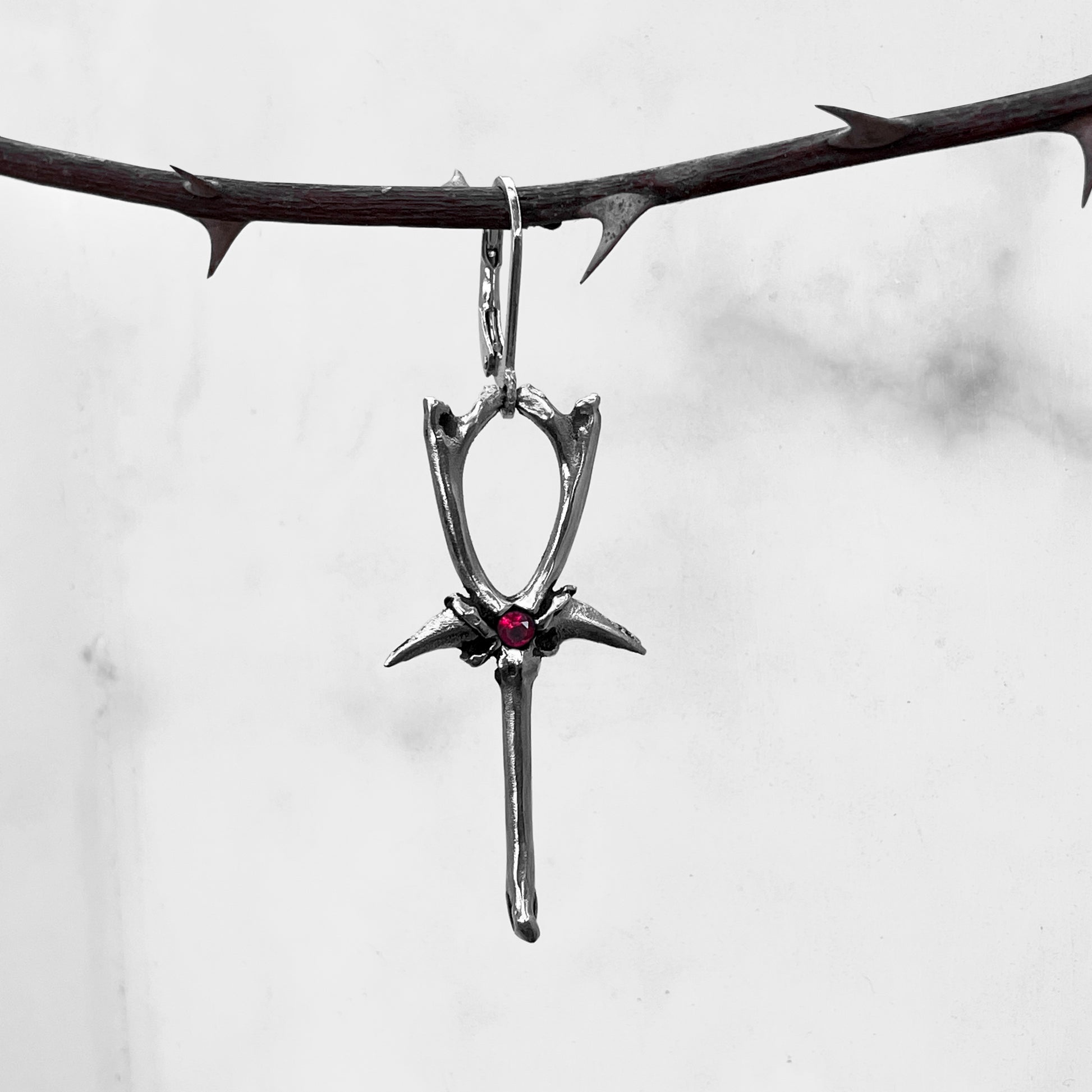 1.5" Solid Sterling Bone Ankh Earring with Ruby and Spring-Lock Hoop