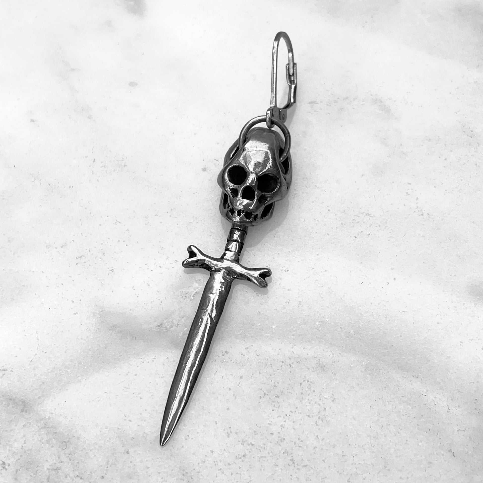 2" Solid Sterling Silver Skull Drop and Dagger combo Earring with Spring-Lock Hoop.